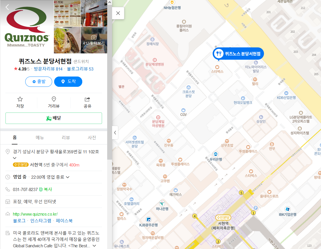 [음식후기] 퀴즈노스 분당서현점 후기퀴즈노스 분당서현점 후기 세계적으로 프랜차이즈점을 갖고있는 퀴즈노스를 다녀와보았습니다.맥도날드만큼 지점이 많지는 않지만, 맛은 있습니다.서현역 근처이시면 간단하게 한끼 샌드위치로 때우실려면 좋은 것 같습니다. 위치는 서현역에...